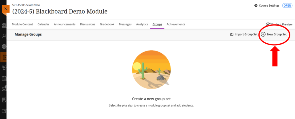 You start the group creation process on the Module Content page. Click the Groups menu item. If you have not created any group sets, you will be prompted to Create a new group set. Click New Group Set in the top right hand corner.