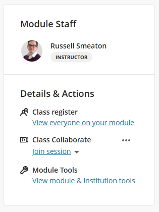 At the top, your Tutors will be listed in the Module Staff panel. Underneath, you can see the Details & Actions panel, containing the following areas: