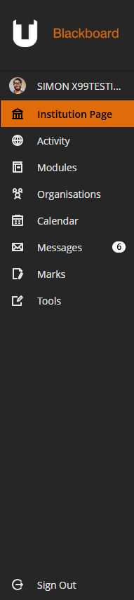- At the bottom of the menu you have the option to Sign Out. If you are using a shared device, it is recommended you sign out of your Blackboard session to ensure security.